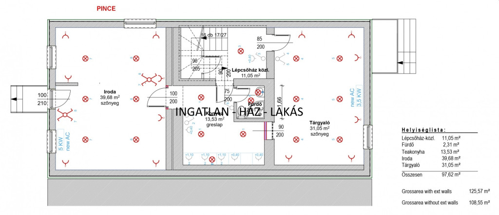 Pince: 125m2, (iroda, tárgyaló, teakonyha, mosdó, zuhanyzó)