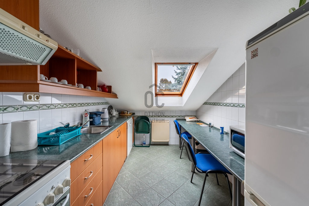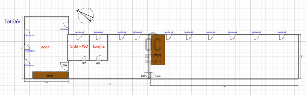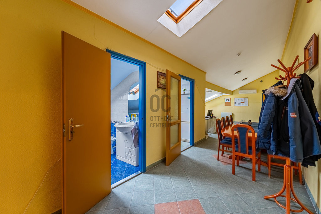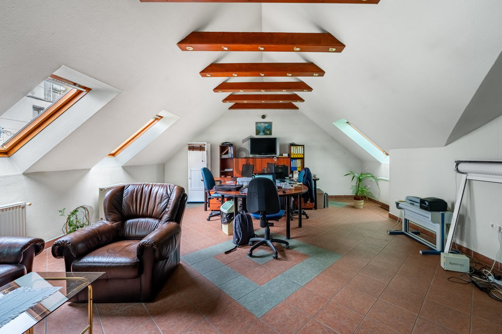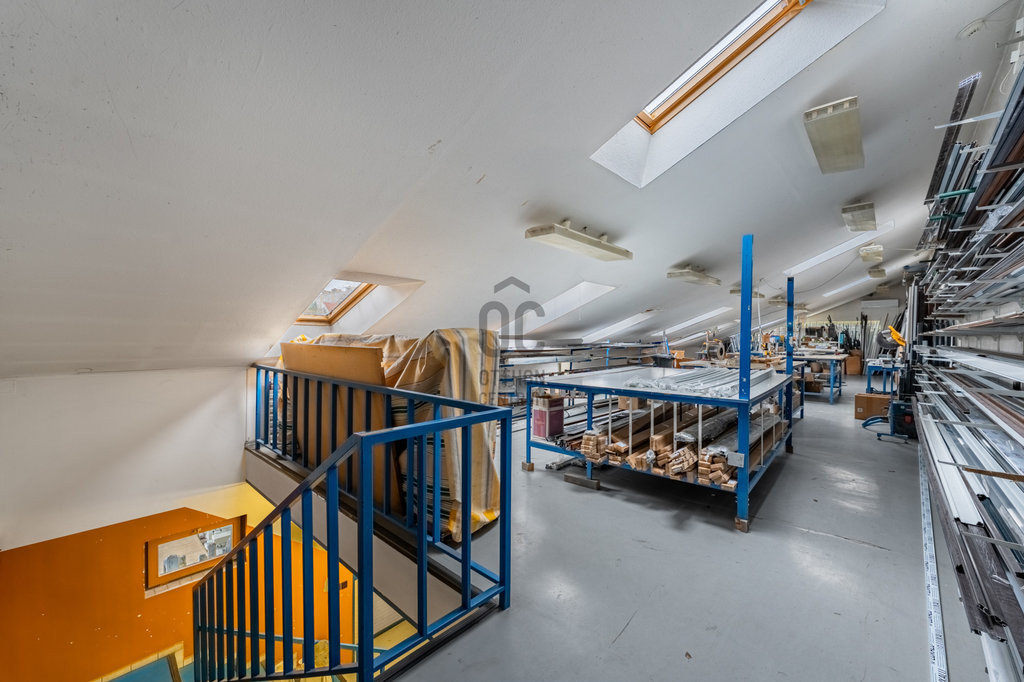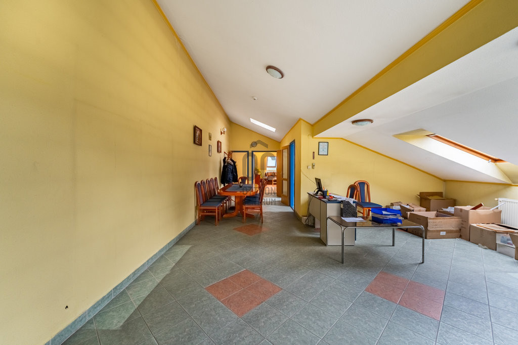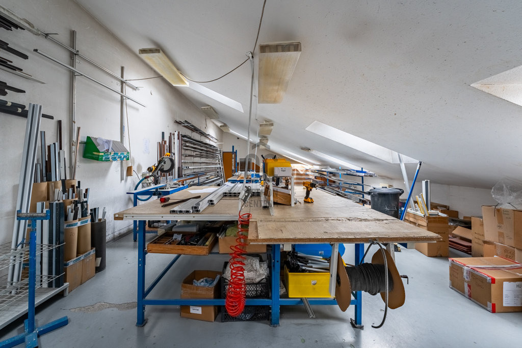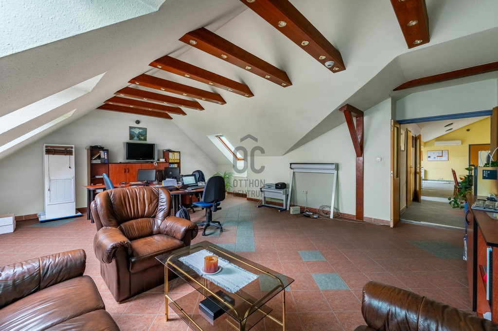A félnyeregtetős, 3,5 m csúcsmagasságú beépített tetőtéren egy nagyobb irodai helyiség, egy fürdőszoba, egy konyha, illetve üzemi funkciókra alkalmas tér található.