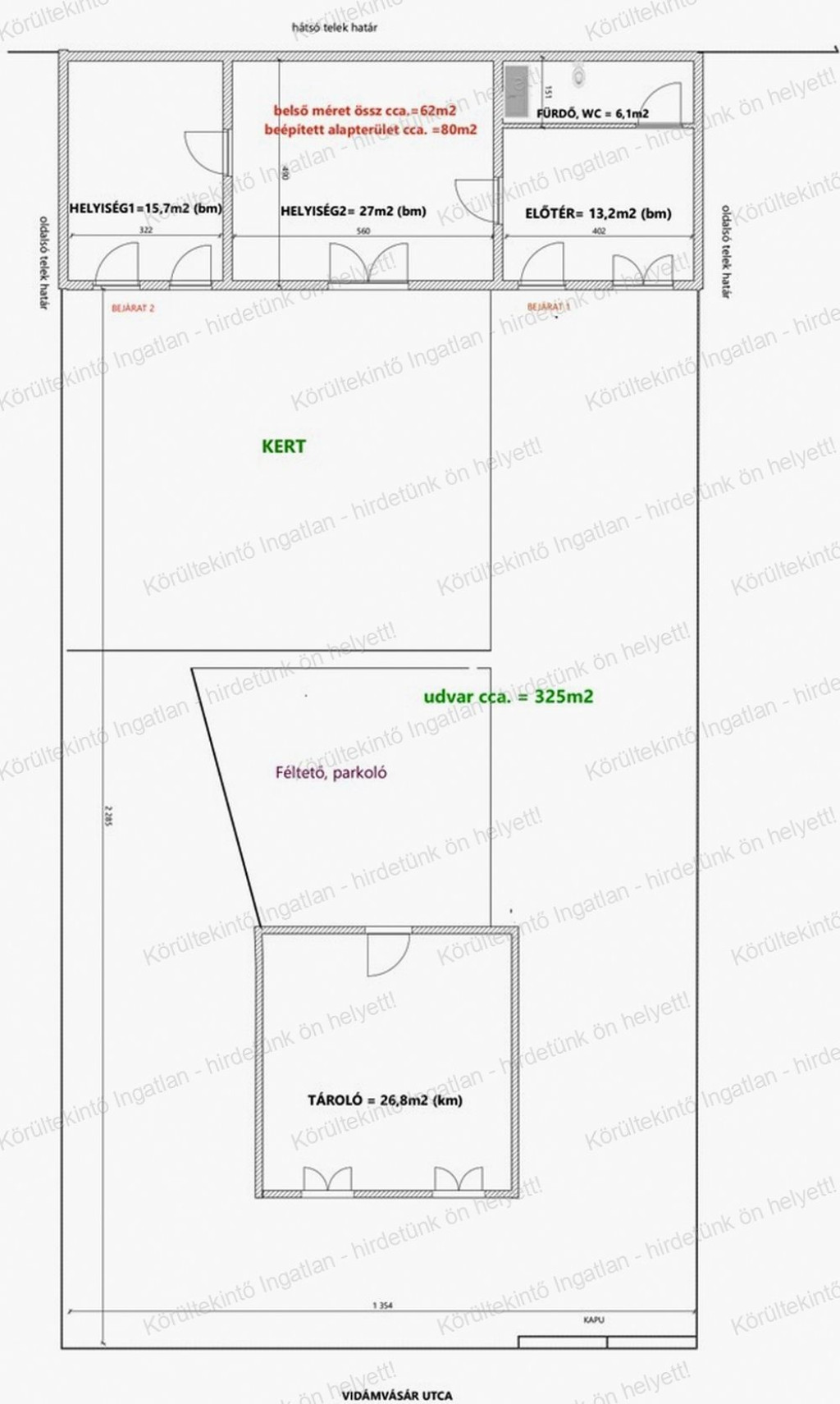 • beépített lakóépületi alapterület kb. 80 m2, lakóterület kb. 62 m2, önálló kb. 325 m2 telekrésszel.