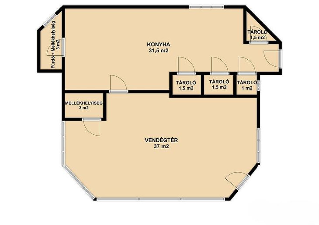 vendég tér, 4 tároló helyiség, konyha, vendég mosdó, személyzeti zuhanyzó + mellékhelyiség.