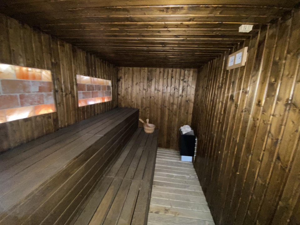 WELLNESS RÉSZLEG: 12 személyes finn szauna (5 m²), Parajdi sófal, Lávakő burkolat.