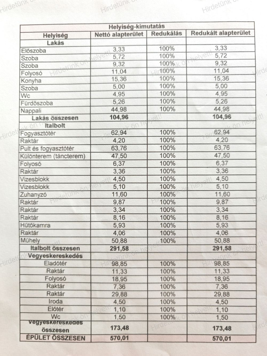 A mintegy 32 helyiségből álló épületkomplexumban a fő kereskedelmi- és vendéglátó-helyiségek mellett sok raktárhelyiség, illetve egy hűtőkamra is helyet kapott. Az ingatlan előtt, illetve a telken belül bőségesen van parkolóhely.