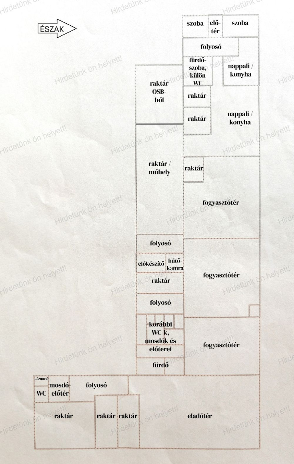 A mintegy 32 helyiségből álló épületkomplexumban a fő kereskedelmi- és vendéglátó-helyiségek mellett sok raktárhelyiség, illetve egy hűtőkamra is helyet kapott. Az ingatlan előtt, illetve a telken belül bőségesen van parkolóhely.