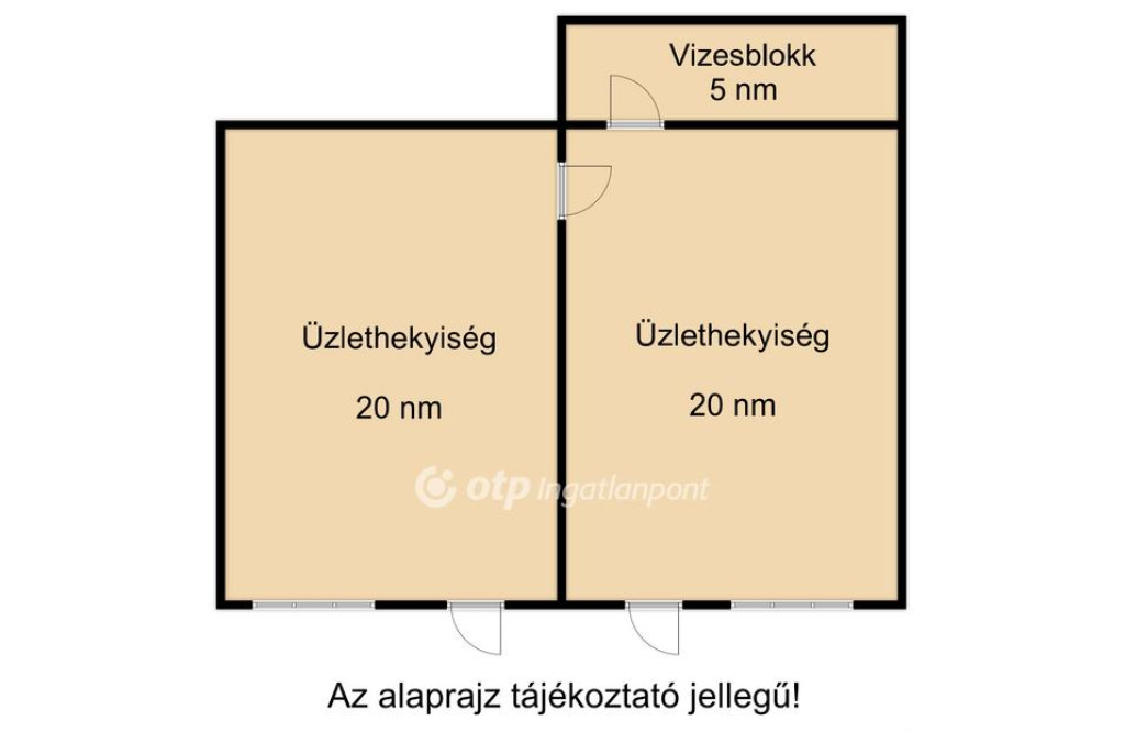 - Elosztása: üzlettér két részre osztva (2x20 nm), 5nm-es közös vizesblokkban, gardrób és WC