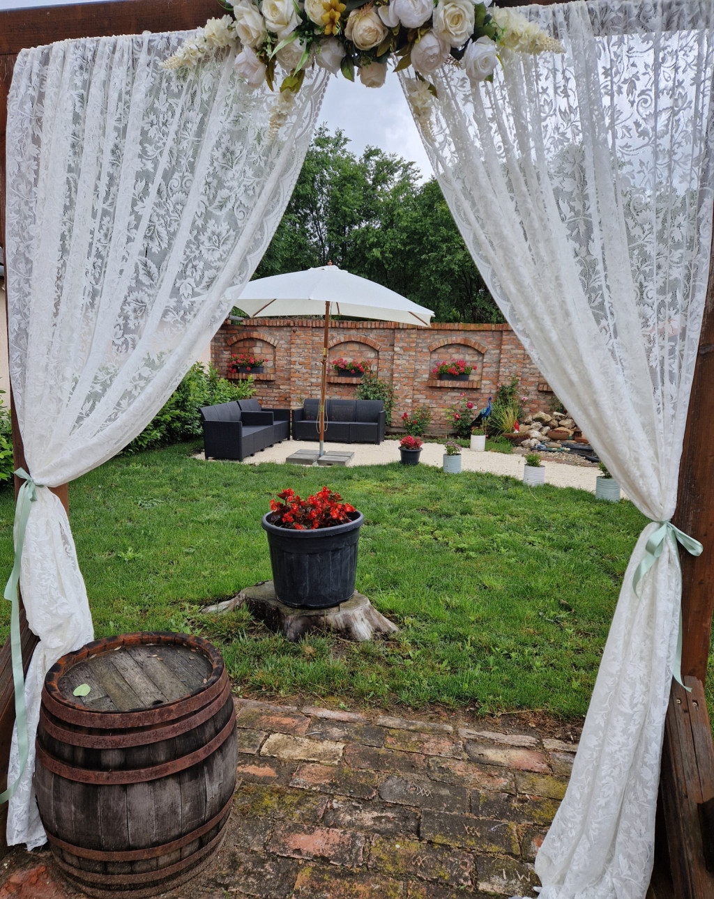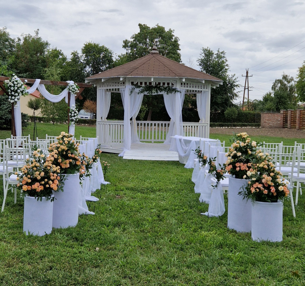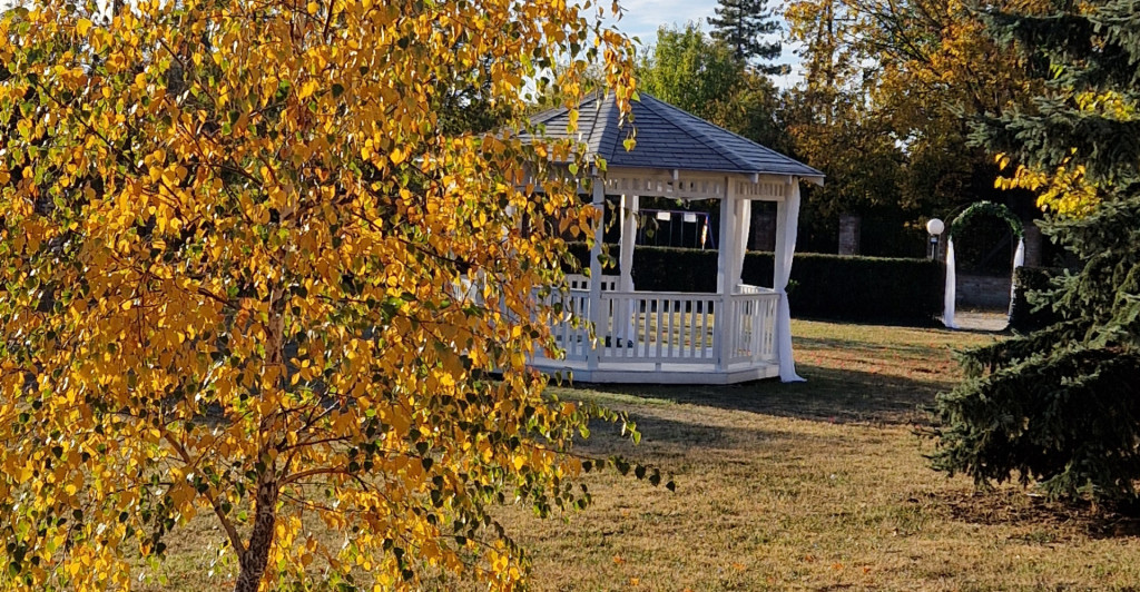 A gondozott, parkosított kert igazi ékköve egy hangulatos kerti pavilon, amely tökéletes helyszínt biztosít esküvői szertartások és szabadtéri rendezvények lebonyolításához.