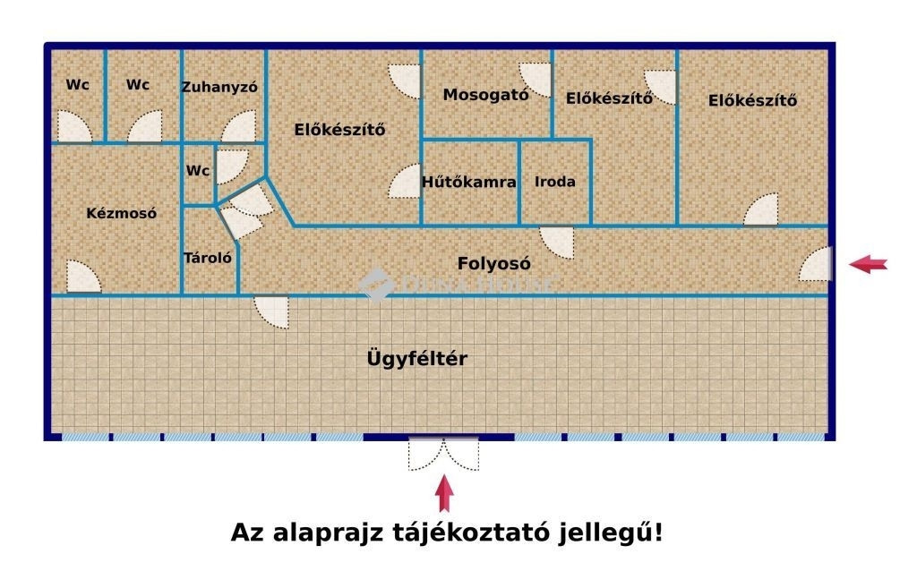 3 előkészítő helység, mosogató, személyzeti mosdó és zuhanyzó, tároló, hűtőkamra, és egy kis iroda is található ahova a kamera rendszer van bekötve. Az ügyfelek részére külön bejáratú koedukált mosdó lett kialakítva. Két külön bejárat található, valamint a nagy teljesítményű gépek miatt ipari árammal is ellátott.