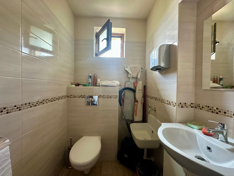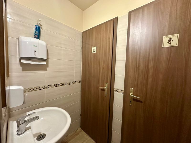 Felosztása a következő (bruttó 106.38m2, nettó 70m2 + pince + teraszok): 2 db. eladó tér, iroda, személyzeti wc, férfi és női mosdó.