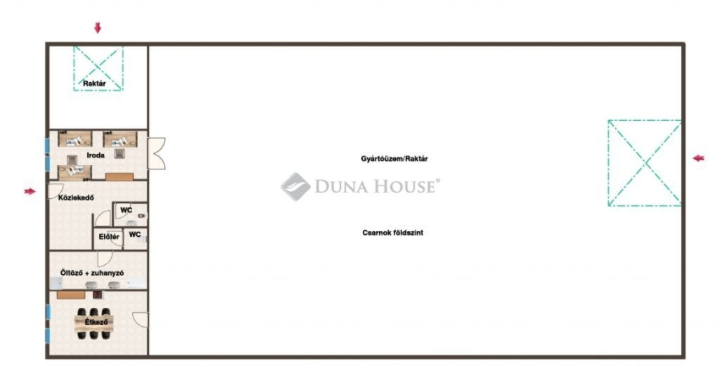 A teljes épület egy gyártó/raktározási csarnoktérből és egy 2 szintes iroda + szociális épületrészből áll.