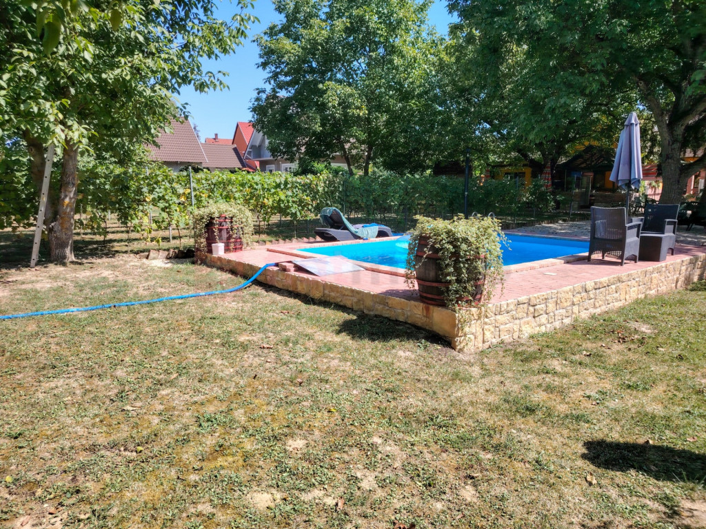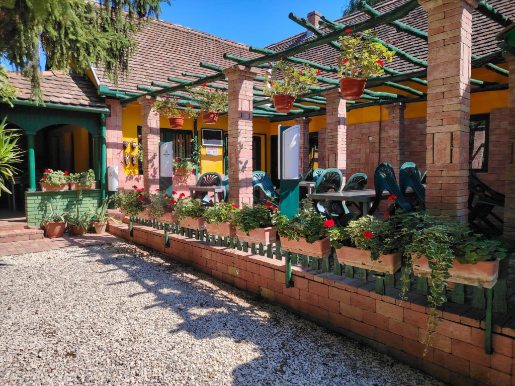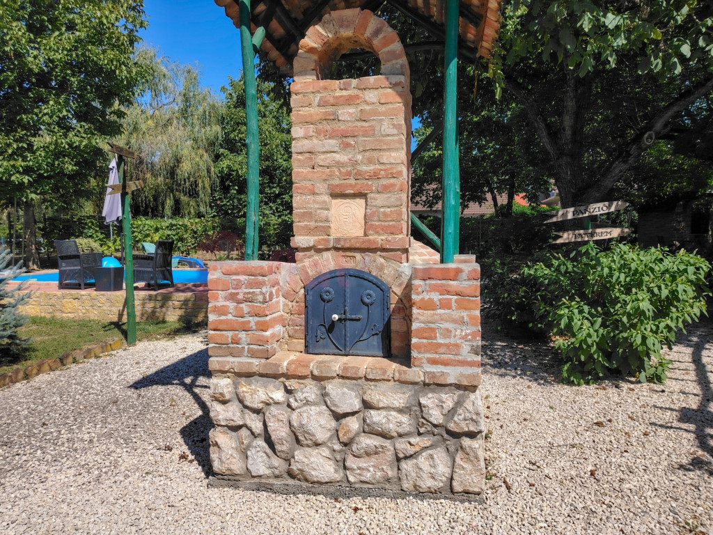 A rendkívül igényesen kialakított közel 2400 m2-es parkosított területen árnyas fák alatt szabadtéri látványkonyha, kemence, bográcsozó és grillező helyek, borozó pavilon mellett egy komplett automata vízforgató és tisztító berendezéssel felszerelt 6 méteres épített medence is várja a vendégeket. Még egy téglából épített kedves galambdúc is díszíti a bejáratot.