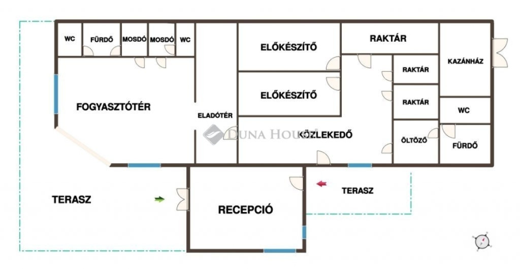 Az épület alsó szintjén recepció található, valamint korábban étkezde/kajálda is működött az ingatlan egy részében. A helyiségek elrendezése miatt továbbra is alkalmas lehet szálláshely, iroda, szolgáltató egység vagy vendéglátóhely kialakítására.