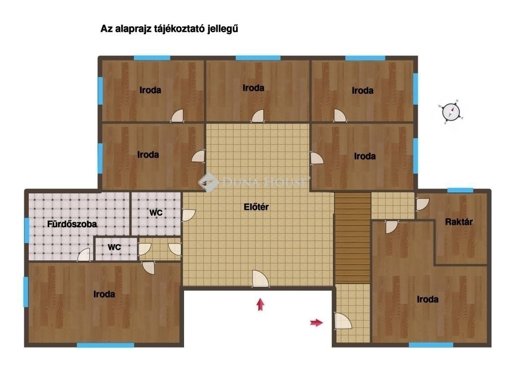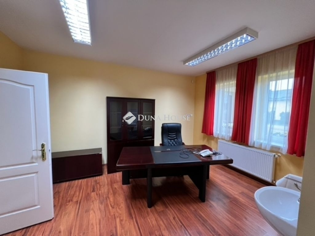 A 218 m²-es földszint irodai funkcióra kialakított, több helyiséggel, előtérrel, raktárral, teakonyhával, valamint női, férfi és mozgássérült mosdókkal. A 137 m²-es tetőtér önálló bejáratú lakrész, amelyben nappali,konyha, étkező és négy, saját fürdőszobás szoba található, így kiváló lehetőség lakhatási célú bérbeadásra, apartmanok kialakítására vagy munkásszállásként történő hasznosításra.