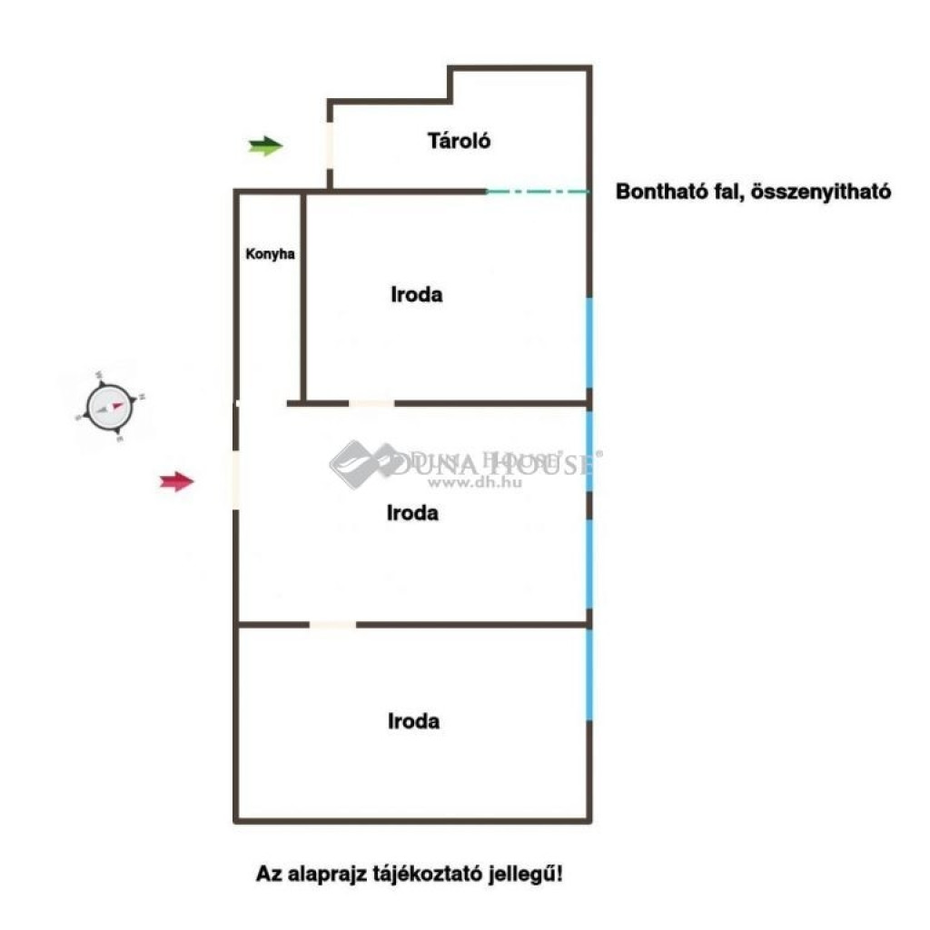 Az iroda alapterülete 65m2, mely 3 irodahelyiségre és egy teakonyhára van osztva jelenleg. Továbbá külön bejárattal egy 10m2-es (jelenleg) tároló helyiség is tartozik hozzá, közvetlen falszomszédságban, így az akár egybe is nyitható az irodával.