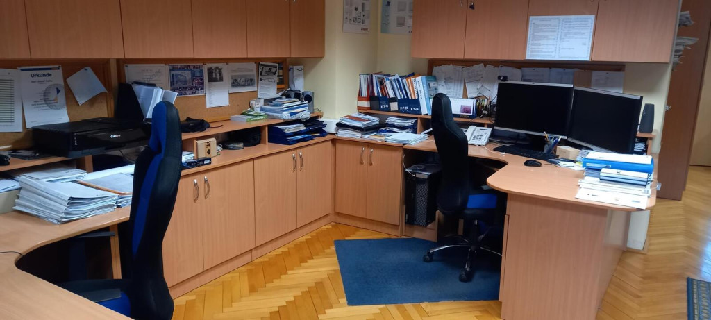 Az iroda három különálló, jól szeparált helyiségből áll, emellett külön konyha, fürdőszoba és WC is kialakításra került. Az erkély világos, kellemes munkakörnyezetet biztosít. A műanyag nyílászárók, a gázcirkó fűtés és a három darab klímaberendezés egész évben komfortos használatot tesznek lehetővé.