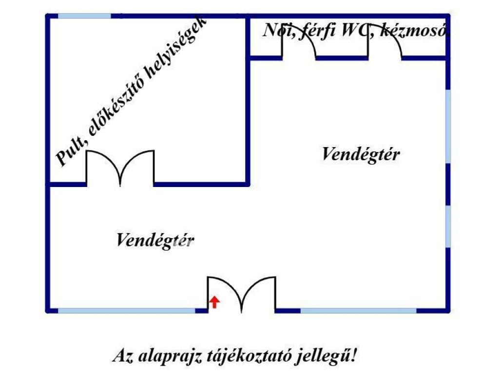 Helyiségek: vendégtér, konyha, tárolók, előkészítők, mosdók (férfi-női-személyzeti).