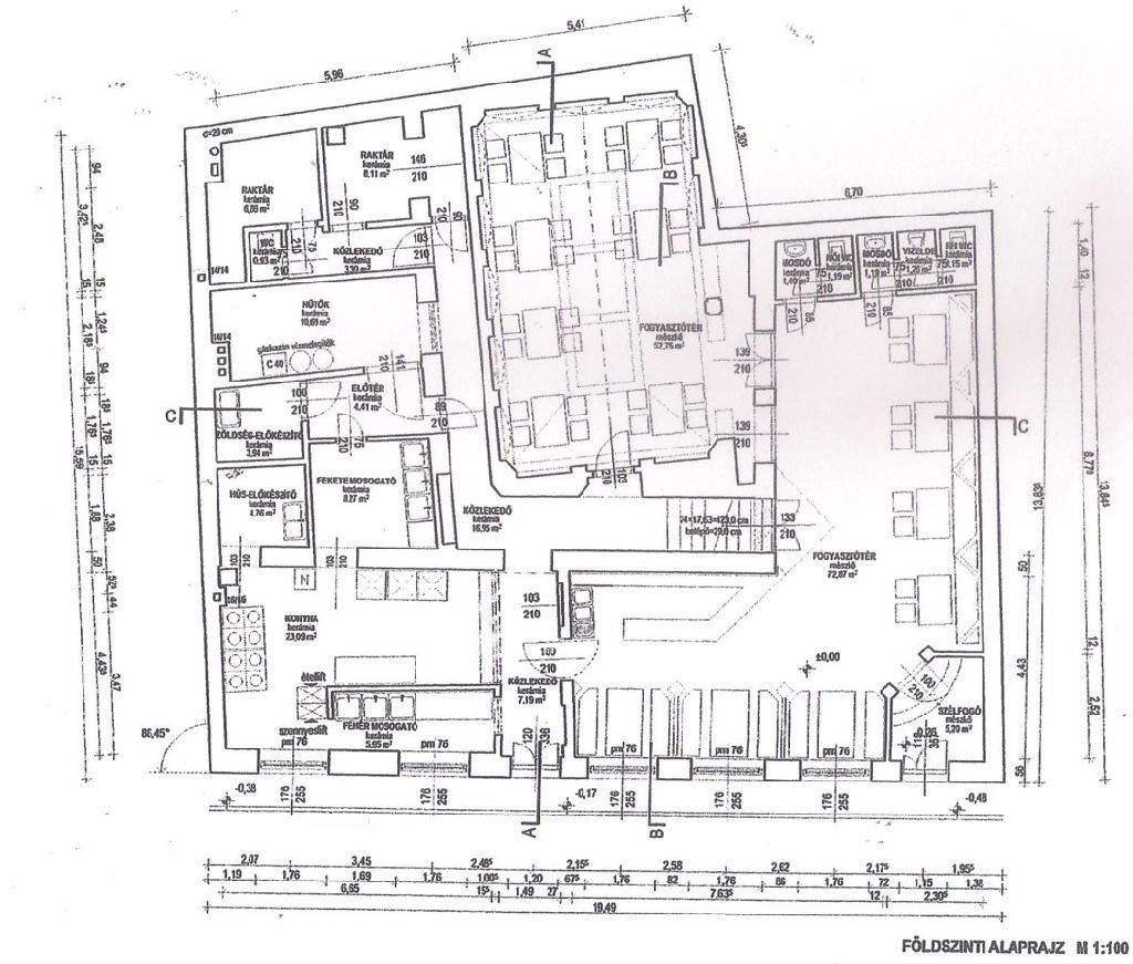 A földszinten éttermi konyha található a hozzá tartozó kiszolgáló helyiségekkel, két vendégtérrel, melyek 80 fő befogadására alkalmasak (240 m2).