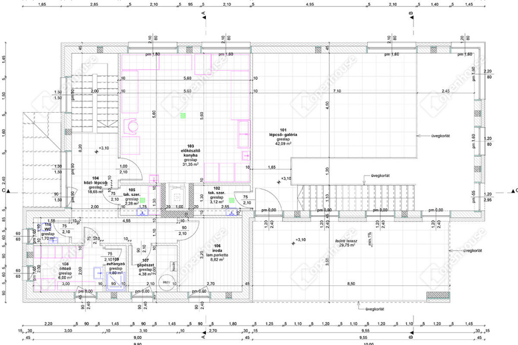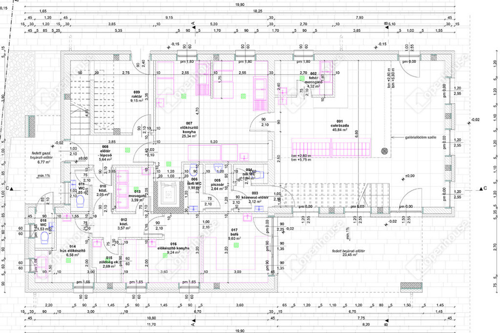 A földszinten és emeleten külön előkészítő konyhák, raktárak, öltözők, iroda és mellékhelyiségek kaptak helyet.