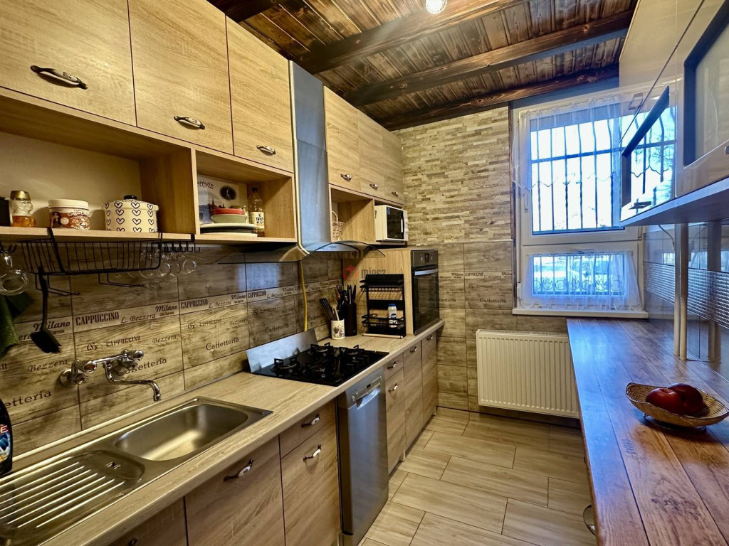 A belső tér modern és karakteres, a konyhában megjelenő kőburkolatok és a mennyezeti, égetett hatású barnás gerendázat különleges, meleg hangulatot adnak a térnek.