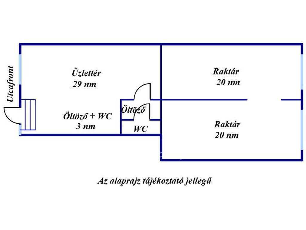 Az összesen 72 nm-es üzlet vásárlóbarát elrendezésű, jól kihasználható, 29 nm-es üzlettérrel rendelkezik. Tartozik hozzá mosdóval ellátott szociális helyiség, valamint két db, egyenként 20 nm-es raktár.