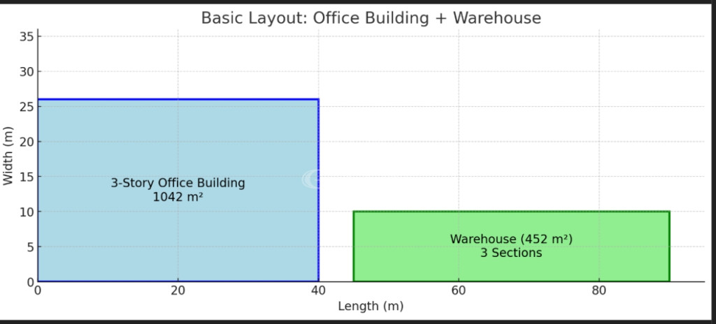 Az ingatlan összesen 1042 m², amely tökéletesen alkalmas irodai és üzleti tevékenységekre, valamint különféle szakmai és ipari célokra.