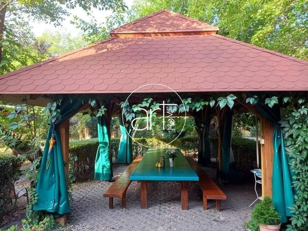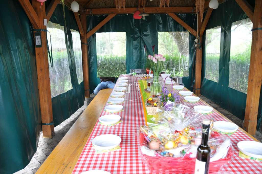 A birtok szíve az eperfák árnyékában kialakított 4 évszakos közösségi tér, ahol egy 16 fős hatalmas asztal kapott helyet ponyvázható szaletli alatt. Mellette kemence és kerti grill kínál felejthetetlen gasztronómiai élményeket.
