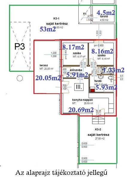 A lakás felosztása a következő (nettó 50.19m2 lakótér + terasz 20.05m2 + saját kert kb. 80m2): előszoba (5.91m2), amerikai konyha - nappali (20.69m2), fürdőszoba + wc (5.93m2), wc kézmosóval (1.33m2), 2 szoba (8.17m2, 8.16m2).