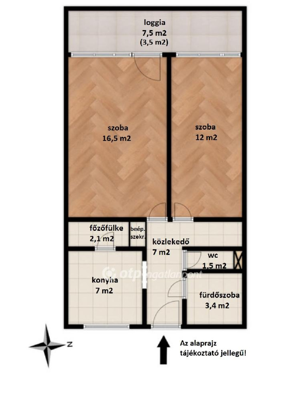Elosztása: két szoba, konyha, kamra, fürdőszoba, külön mellékhelyiség, közlekedő, loggia.