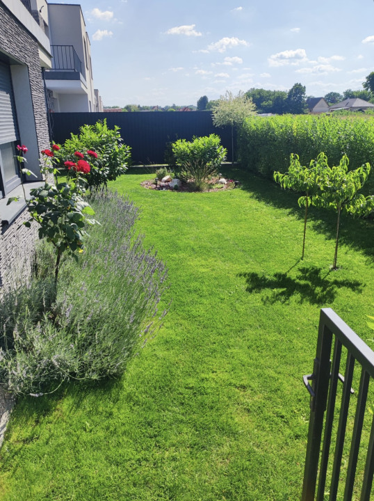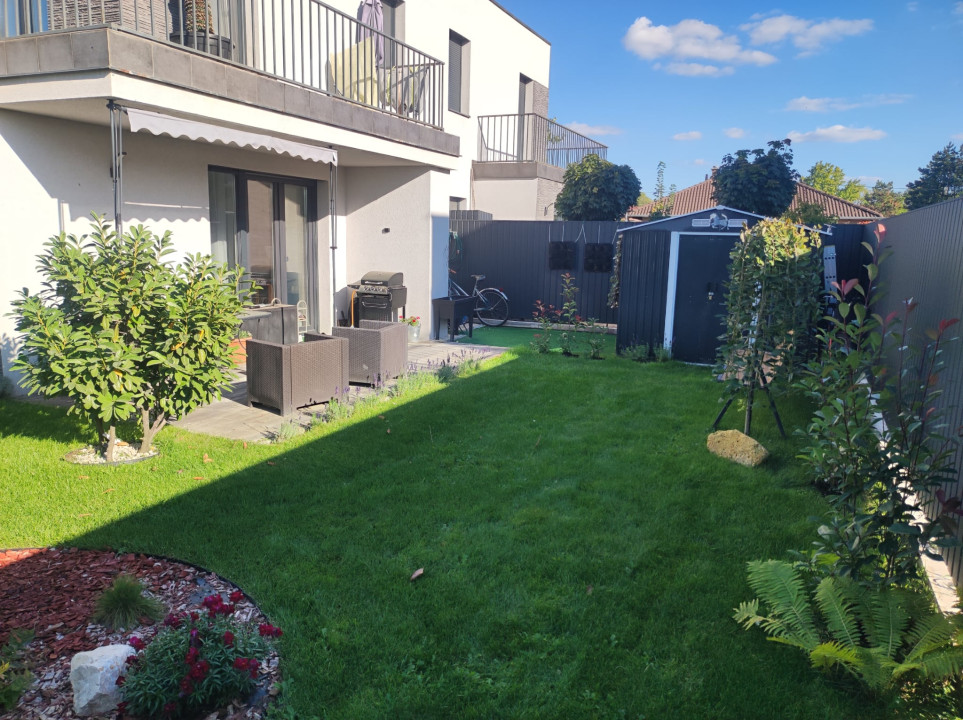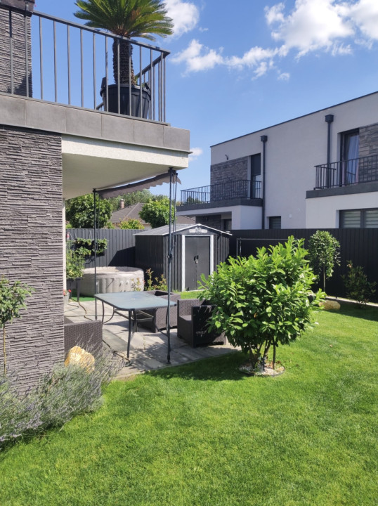 A nappaliból kilépve egy 14 m²-es terasz, majd egy 127 m²-es, gyönyörűen parkosított, kizárólagos használatú kert várja új tulajdonosát. A kert ékköve a jakuzzi, amely a vételár részét képezi, valamint egy praktikus kerti tároló is helyet kapott.