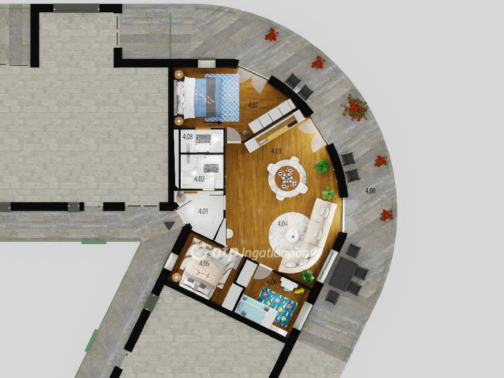 Ez a 90 m2-es I. emelet 4. lakás, amihez 64,1 m2 -es terasz tartozik.