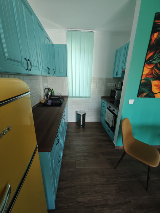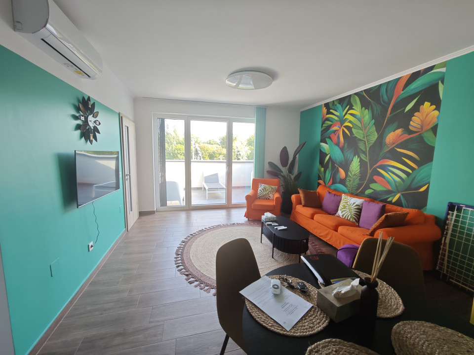 A vidám színekkel berendezett, fiatalos lakás elhelyezkedése nagyon kedvező, strand, boltok, tömegközlekedés sétatávolságon belül találhatóak.