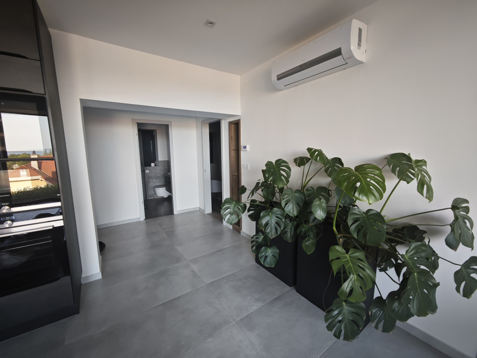 A lakás fűtéséről (padlófűtés) és melegvíz ellátásáról fan-coil rendszerű hőszivattyú gondoskodik.