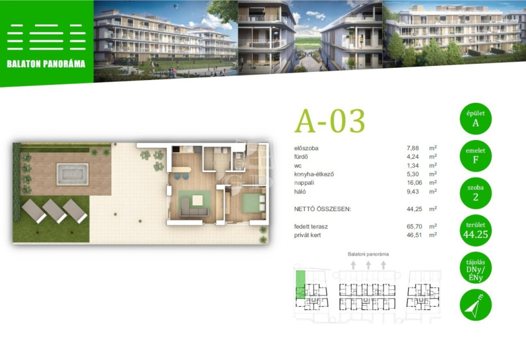 Az épületszárnyak közötti sétányokon burkolt terek és kiemelt kazettákban elhelyezett intenzív zöldtetők kerülnek kialakításra. A Balaton felé néző közös használatú kertrészben pedig egy szintén közös használatú medence is helyet kap.