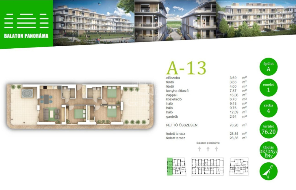 Ez a lakás nappali+3 hálós, 76nm alapterületű+ tartozik hozzá két (29nm+29nm) összesen 58nm fedett terasz is.