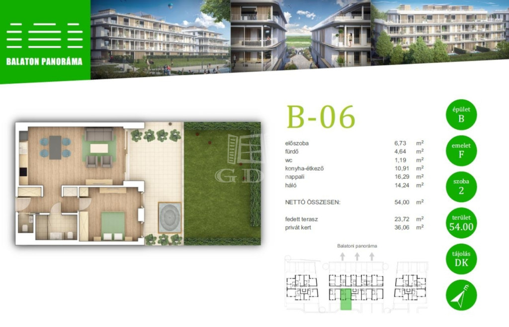 Ez a lakás nappali+1 hálós, 54nm alapterületű+ tartozik hozzá egy 24nm-es fedett terasz és 36nm privát kert is.