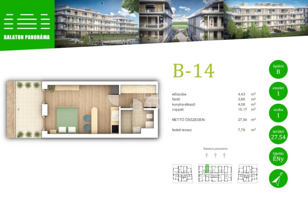 Az épületegyüttes a földfelszín alatt, a pinceszinten (parkoló szinten) egy tömeget képez, mely a földfelszín felett három épületszárnnyá (lépcsőházzá) válik szét. Az épületszárnyak közötti sétányokon burkolt terek és kiemelt kazettákban elhelyezett intenzív zöldtetők kerülnek kialakításra. A Balaton felé néző közös használatú kertrészben pedig egy szintén közös használatú medence is helyet kap.