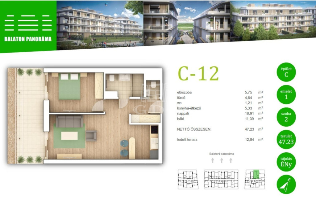 Ez a lakás nappali+1 hálós, 47nm alapterületű+ tartozik hozzá egy 13nm-es fedett terasz is.