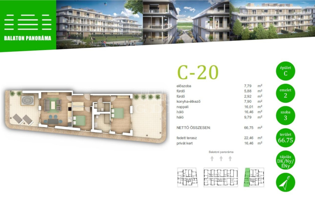 Ez a lakás nappali+2 hálós, 67nm alapterületű+ tartozik hozzá két (22nm+31nm) összesen 53nm fedett terasz is.