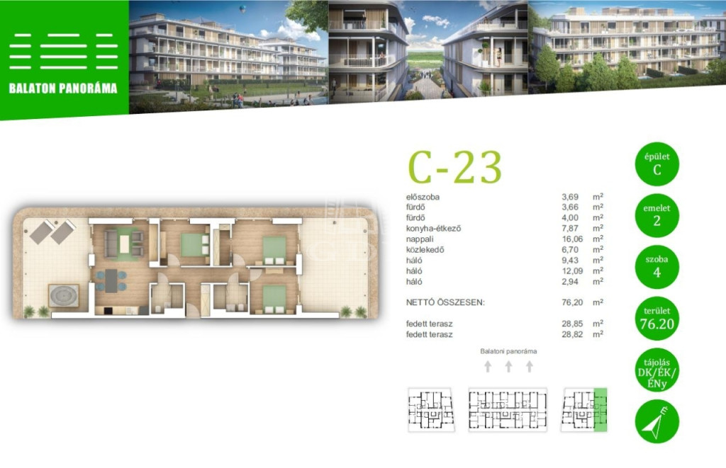 Ez a lakás nappali+3 hálós, 76nm alapterületű+ tartozik hozzá két (29nm+29nm) összesen 58nm fedett terasz is.
