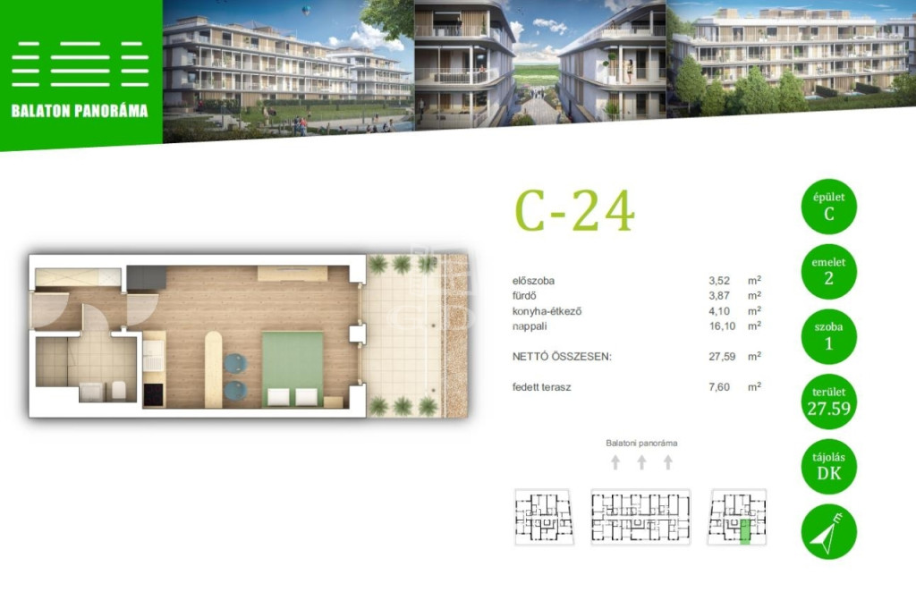 Az épületegyüttes a földfelszín alatt, a pinceszinten (parkoló szinten) egy tömeget képez, mely a földfelszín felett három épületszárnnyá (lépcsőházzá) válik szét. Az épületszárnyak közötti sétányokon burkolt terek és kiemelt kazettákban elhelyezett intenzív zöldtetők kerülnek kialakításra. A Balaton felé néző közös használatú kertrészben pedig egy szintén közös használatú medence is helyet kap.