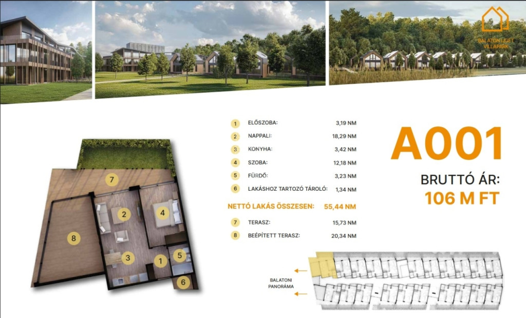Az első emeleten további 21 lakás érhető el, 47–75 m² közötti méretben.