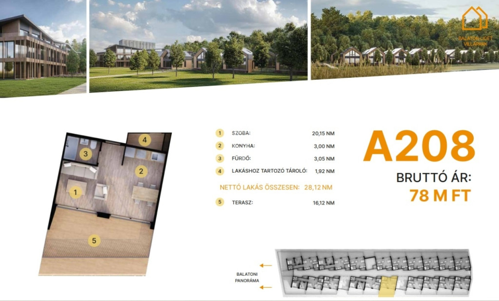 Az első emeleten további 21 lakás érhető el, 47–75 m² közötti méretben.