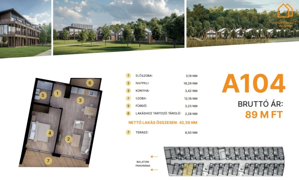 Az első emeleten további 21 lakás érhető el, 47–75 m² közötti méretben.