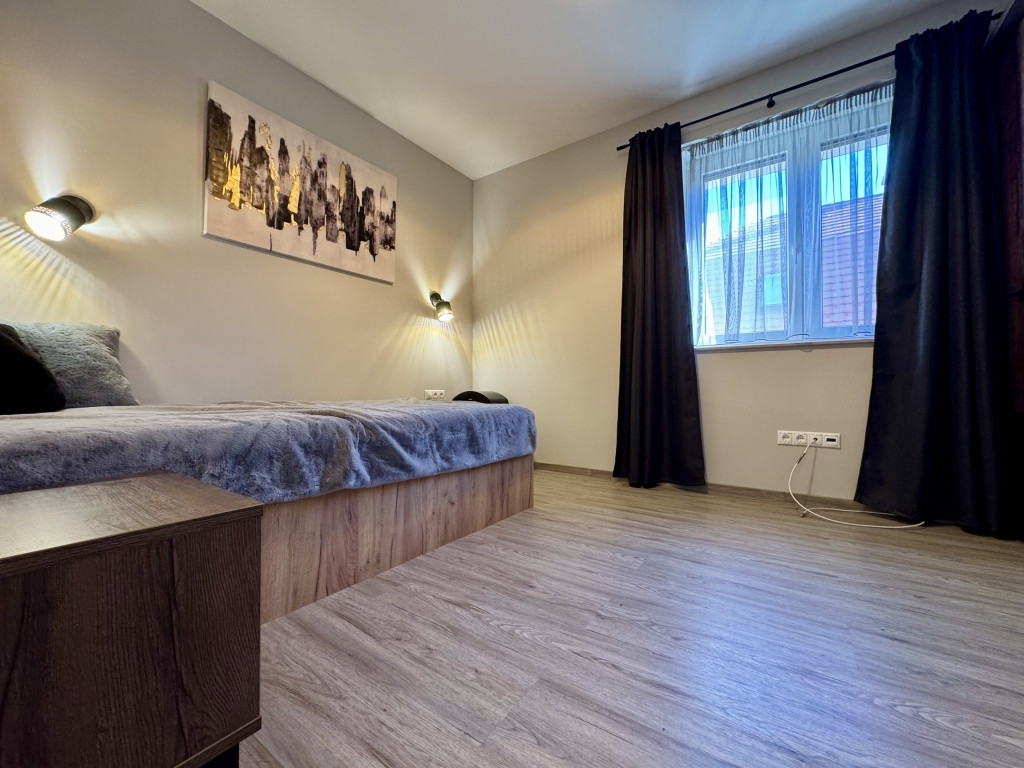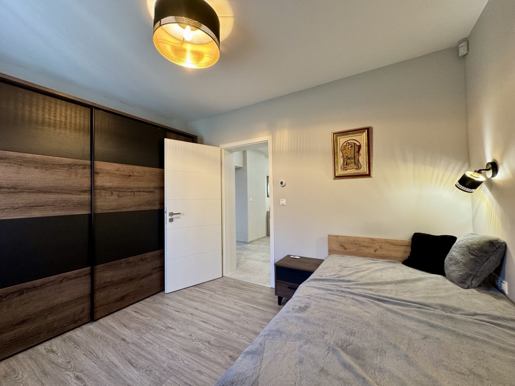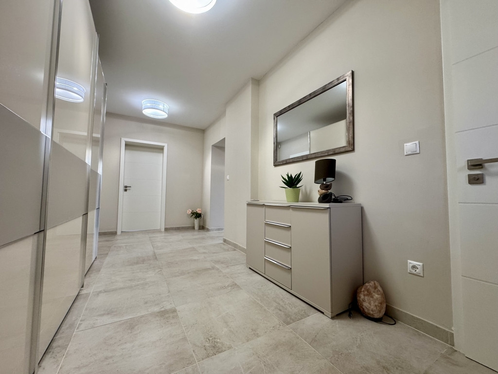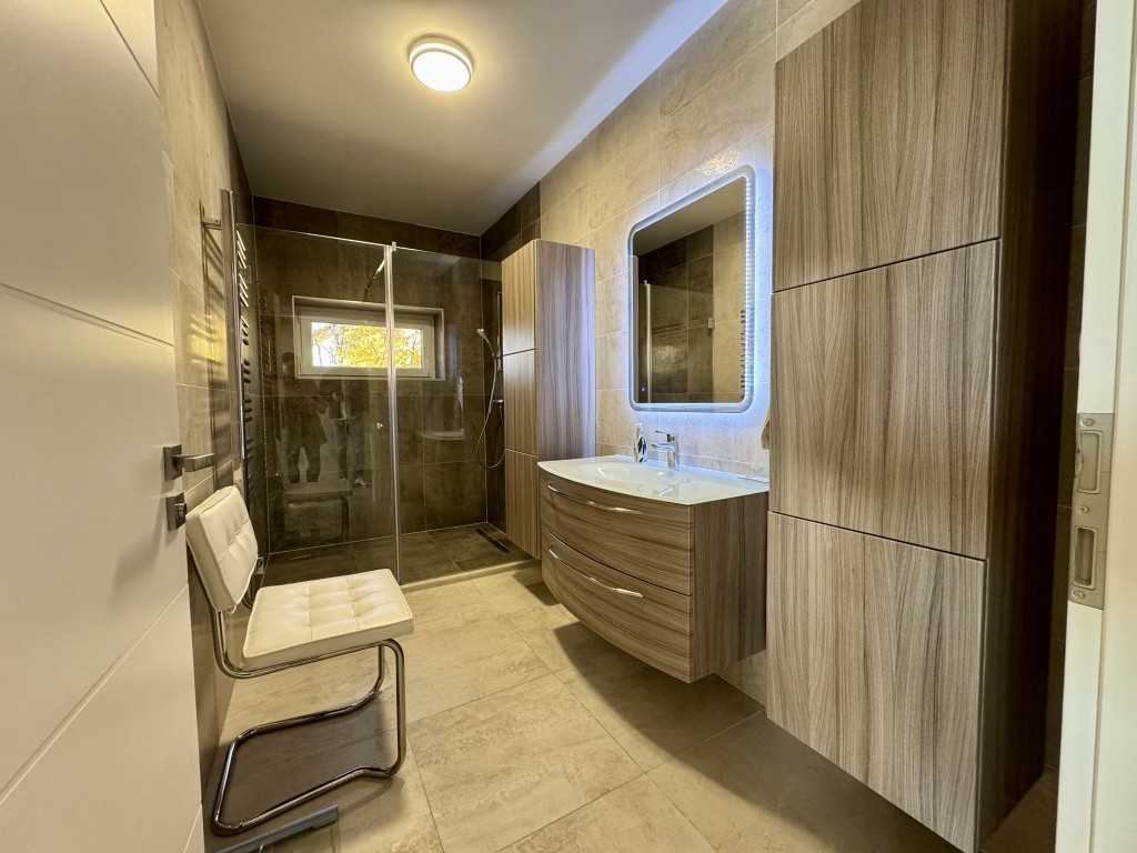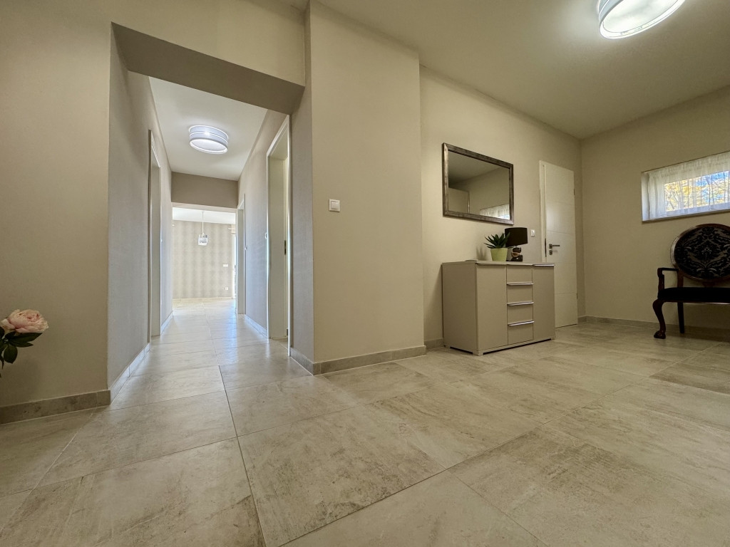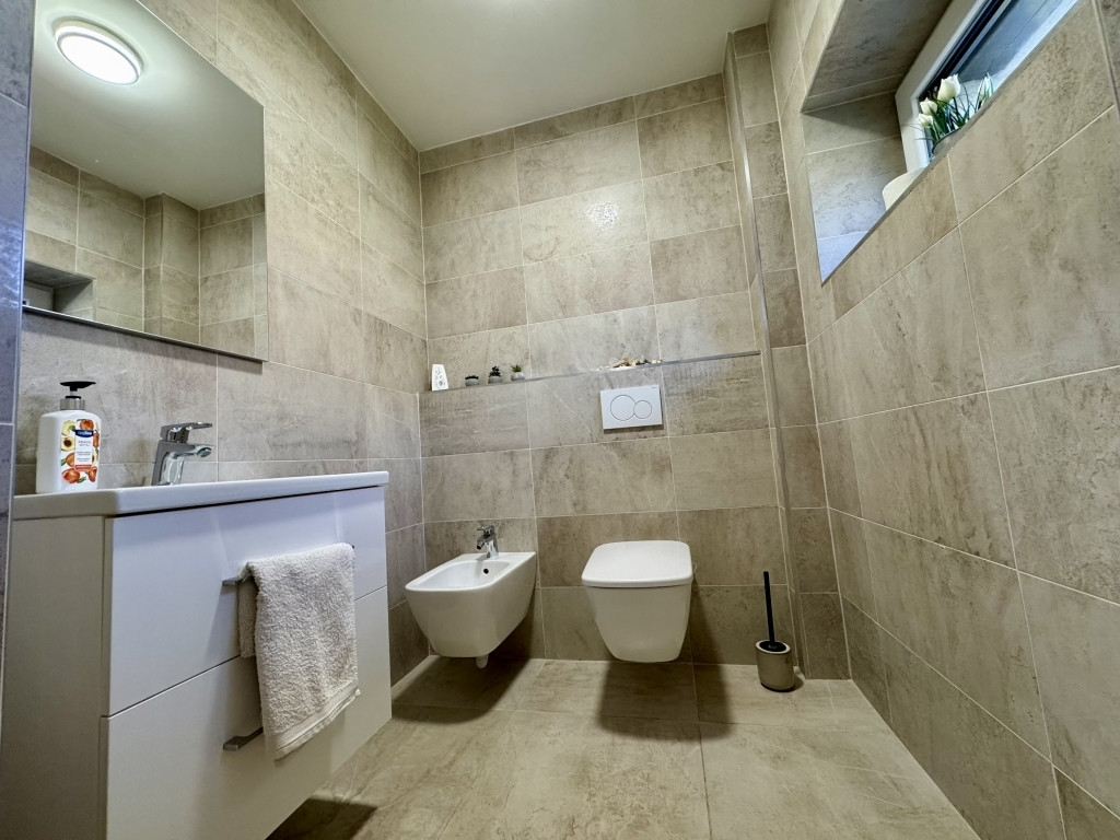 Minőségi, MARAZZI burkolatok, szaniterek, három rétegű üvegezéssel, nagy méretű nyílászárók, amelyek szúnyoghálóval és elektromos redőnnyel ellátottak.
