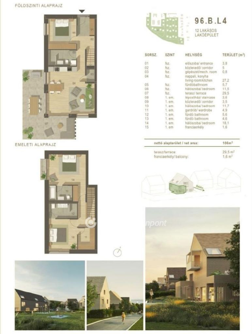 96/B_L4 lakás nettó alapterülete 106 m2-es 3 hálószoba + nappali elrendezésű. A lakáshoz tartozik még egy 12,5 m2 teremgarázs hely és egy önálló garázs , 2 m2-es tároló és 29,5 m2-es terasz, 1,6 m2-es franciaerkély.