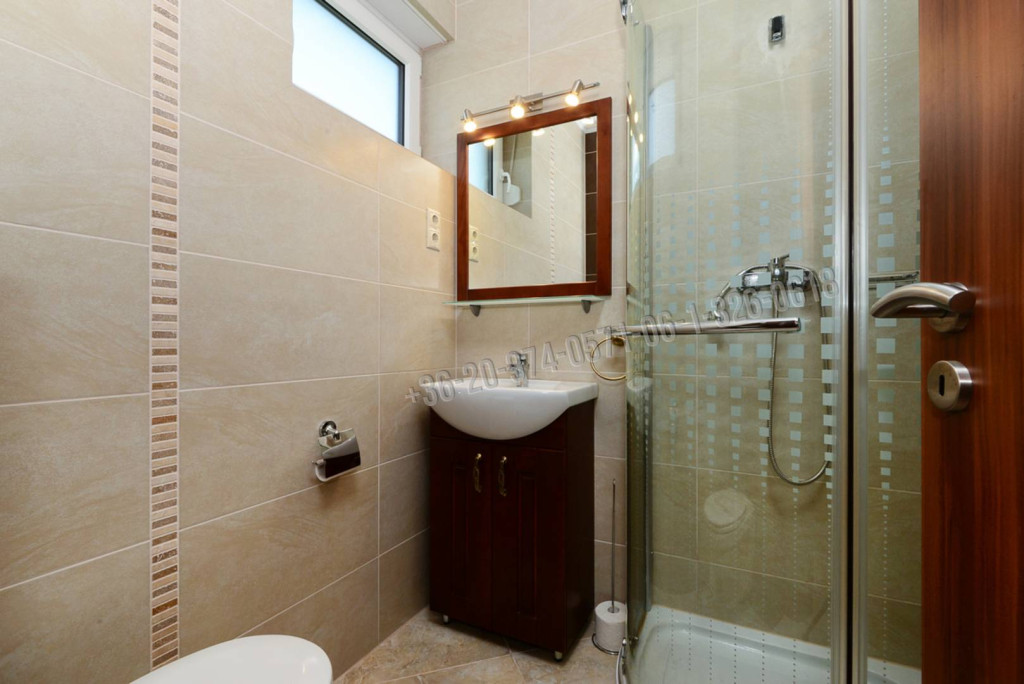 A lakásban hatalmas amerikai konyhás nappali étkezővel, körben hatalmas ablakokkal, egy hálószoba, nagy méretű 28 nm-es panorámás terasz Balatonra néző kilátással, 2 fürdőszoba és előszoba található. A nagyobbik fürdőszobában kád és zuhanyzó, wc, bidé, duplamosdó, a másik fürdőben zuhanyzó és wc. Modern hőszivattyús fűtés az épületben, mennyezeti és falfűtéssel és hűtéssel.