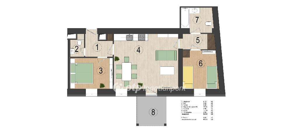 Az átgondolt elrendezésnek köszönhetően a lakás kényelmes és jól használható tereket kínál. A tágas nappali a lakás központi része, amely közvetlen kapcsolatban áll a terasszal. A két külön nyíló szoba ideális hálószobának, vendégszobának vagy akár dolgozószobának is. A külön WC, a gardrób és a jól elkülönített fürdőszoba tovább növeli a mindennapi komfortot.