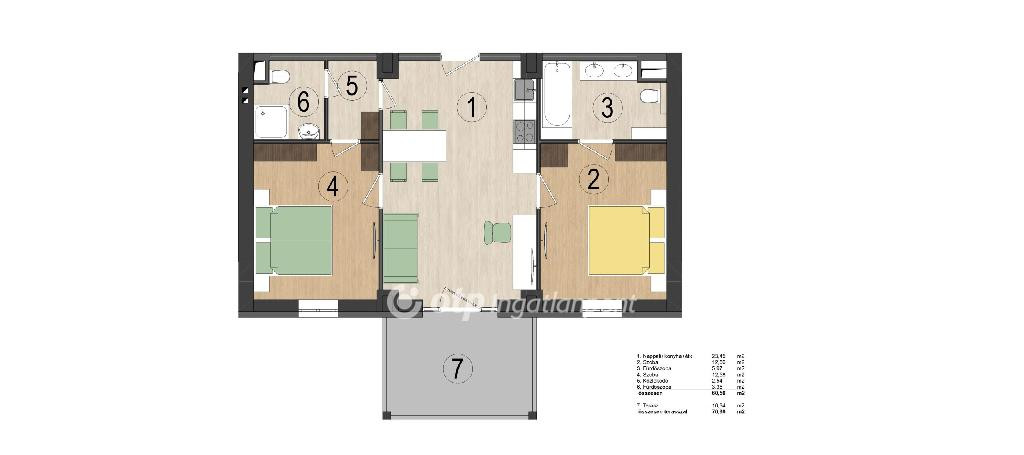 Az ingatlan 60,56 m2 lakótérrel rendelkezik, amelyhez egy 10,34 m2-es terasz kapcsolódik. A lakás déli tájolásának köszönhetően világos és kellemes életteret biztosít.