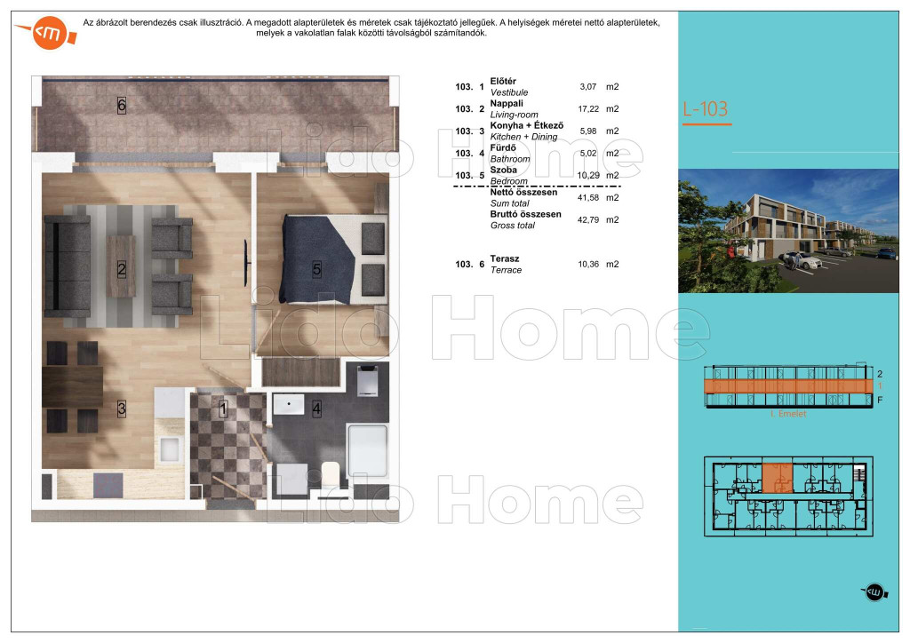 Az első emeleti, keleti tájolású lakás hasznos alapterülete: 42,79 m2, terasz: 10,36 m2.
