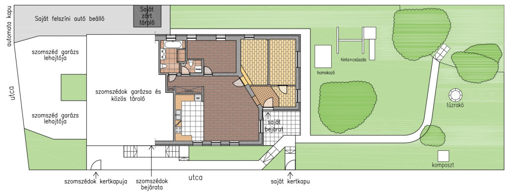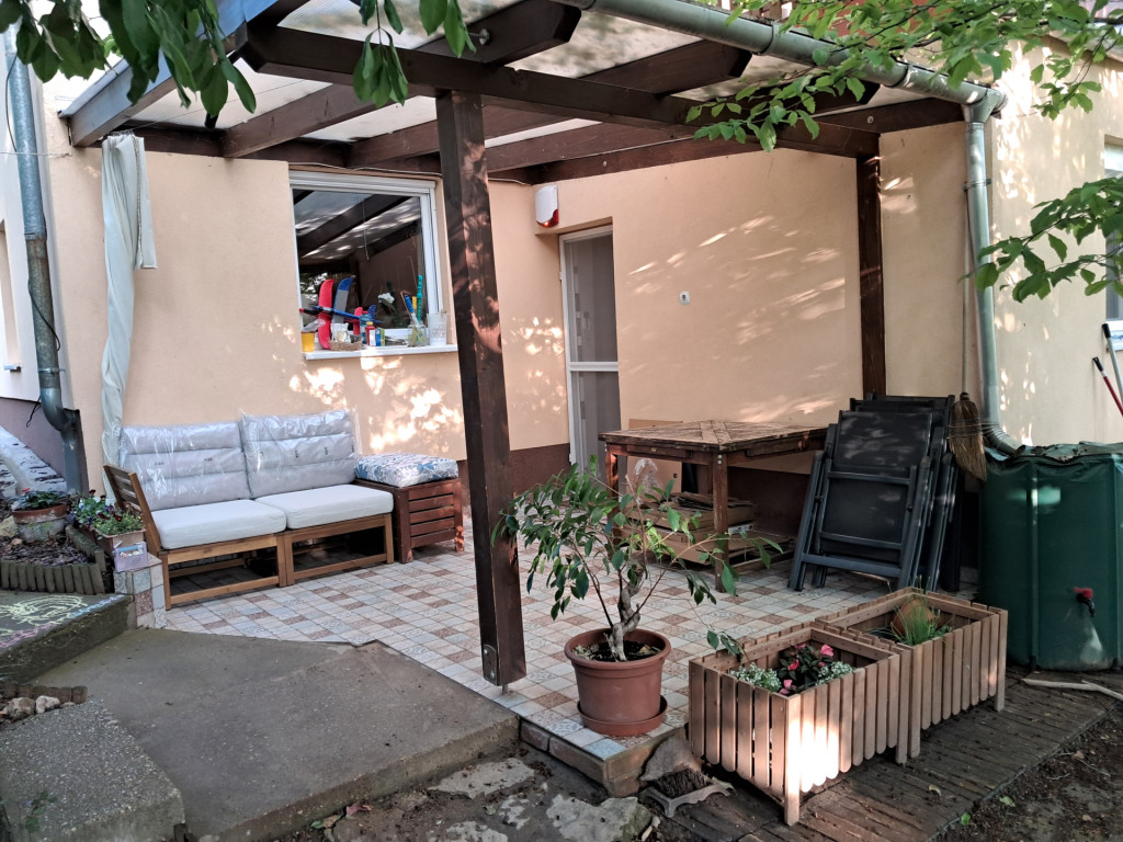 Az előszobából közvetlen kijárat nyílik a 9 m²-es fedett teraszra és a közös kertbe, amely ideális pihenésre, gyerekeknek játékra vagy barátokkal grillezésekhez.