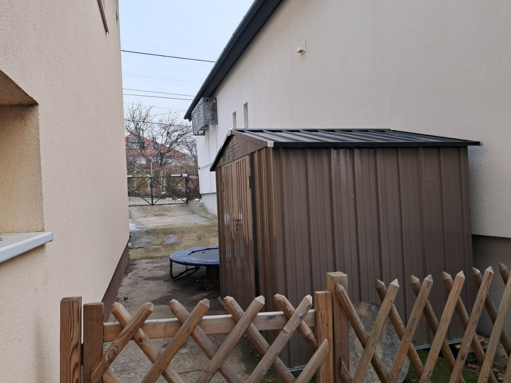 Továbbá tartozik hozzá egy, a társasházon belül található száraz tároló helyiség, mely a szomszédokkal közös használatú és a kertben egy saját használatú fém kerti ház (biciklik, szerszámok tárolására).