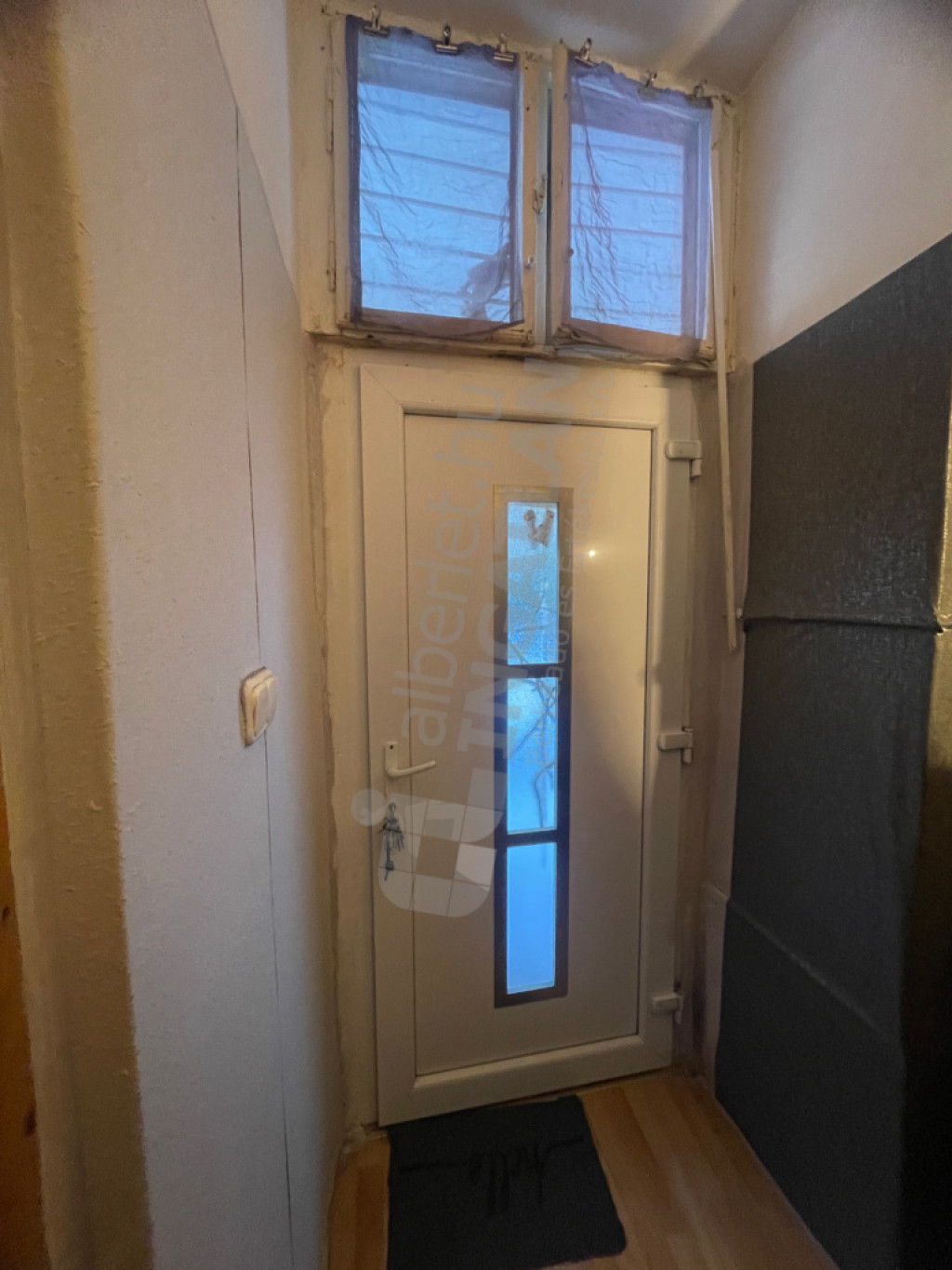 A bejárati ajtó műanyag, az ablakok fa dupla keretesek.